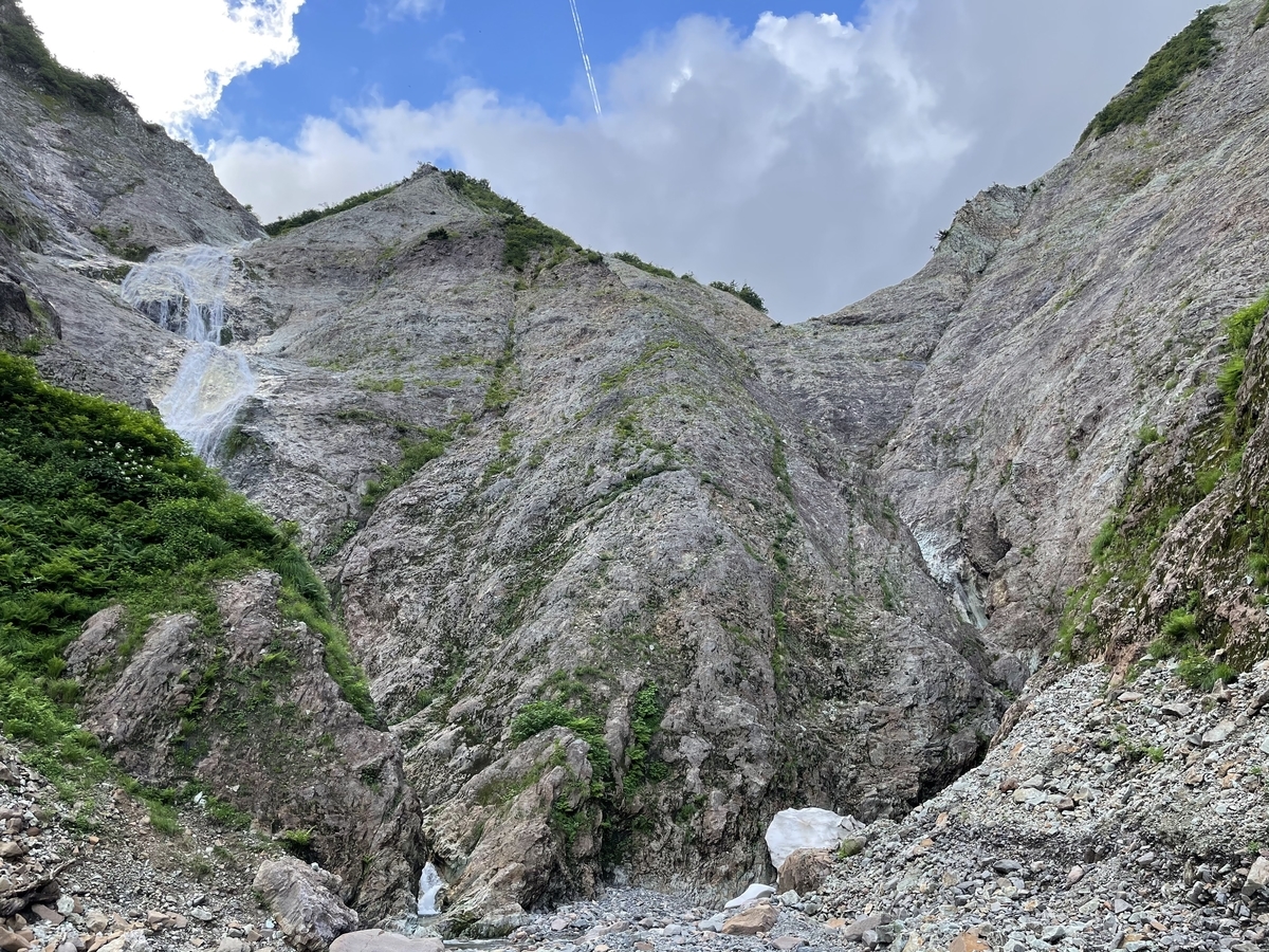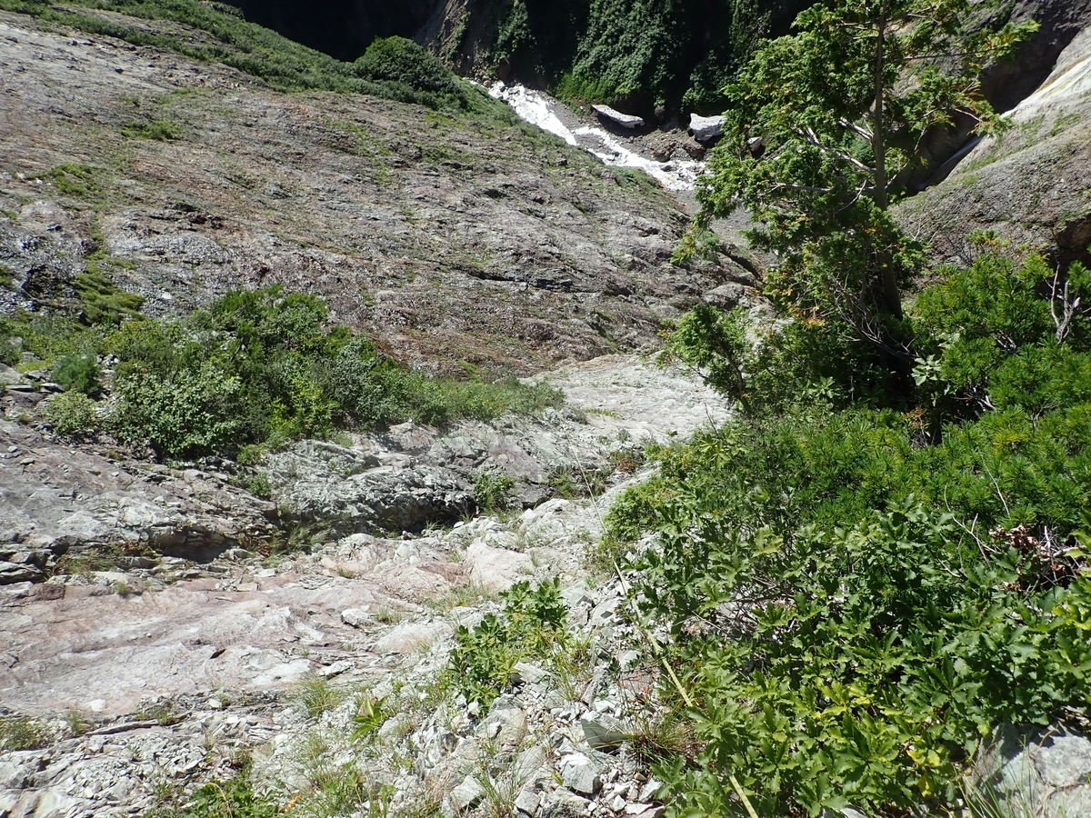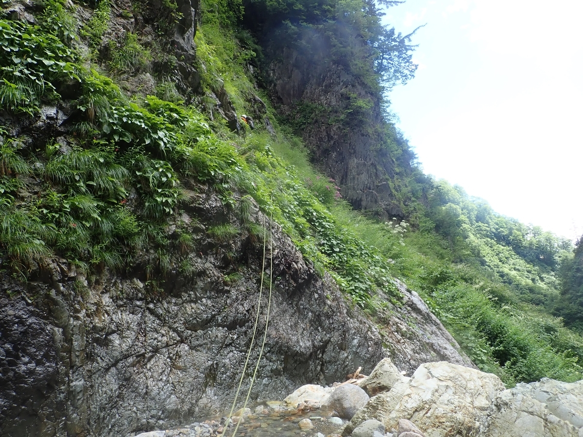 高さがあるが、画像ではわかりにくいが上の方には両足で余裕で立てる棚があるので、実質は2mぐらい。沢で出てきてもまぁノーロープで登るかなってぐらいの岩だ。